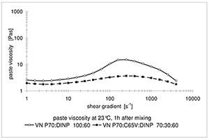 以Vinnolit P70糊樹脂與中等增塑劑量配成的漿料,在低剪力時(shí)顯示牛頓性流變,在高剪力時(shí)會(huì)是中級(jí)的擴(kuò)容型流變。加入摻混樹脂例如Vinnolit的C65V會(huì)馬上減低或消除這種擴(kuò)容性流變情況。